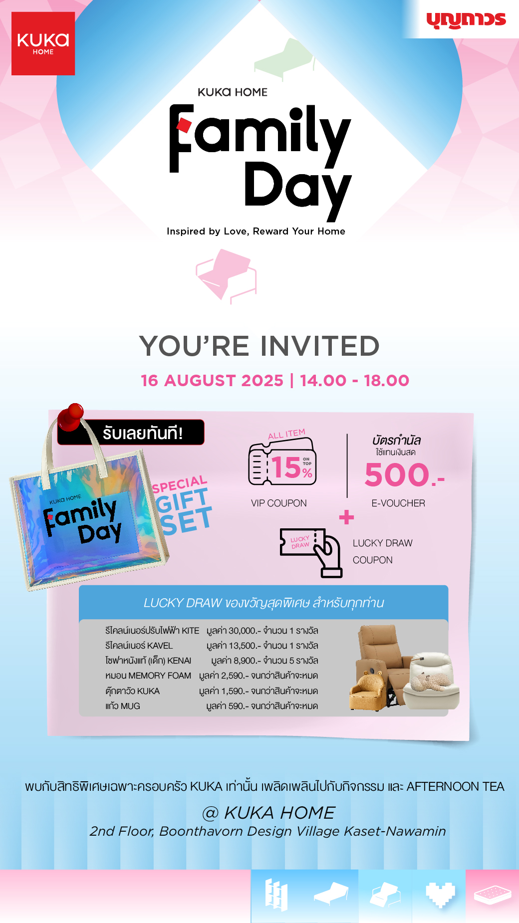 เชิญร่วมสัมผัสประสบการณ์แห่งความอบอุ่นที่ถ่ายทอดผ่านเฟอร์นิเจอร์ระดับโลกจาก KUKA ในงานที่จัดขึ้นเพื่อครอบครัวคนพิเศษของเราโดยเฉพาะ